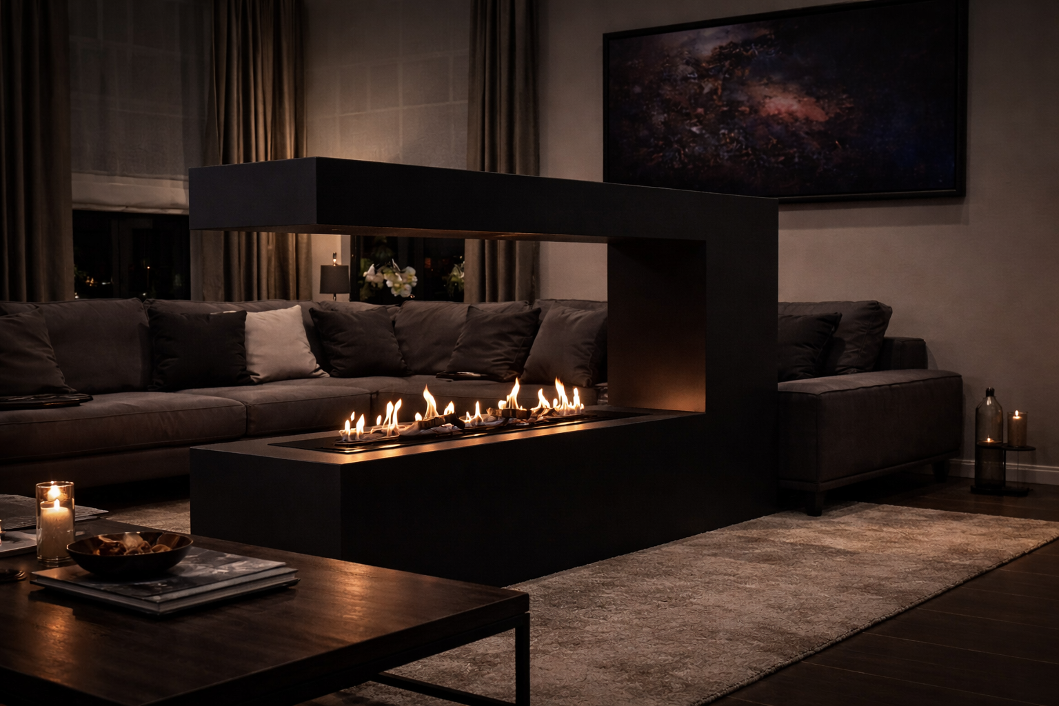 Discover the Fame vertical see-through fireplace from Wild Flame, a modern addition to any interior that creates a warm and cozy atmosphere. With its double-glazed design, this fireplace offers a beautiful view of the flickering flames from both sides, making it a focal point in your living space.