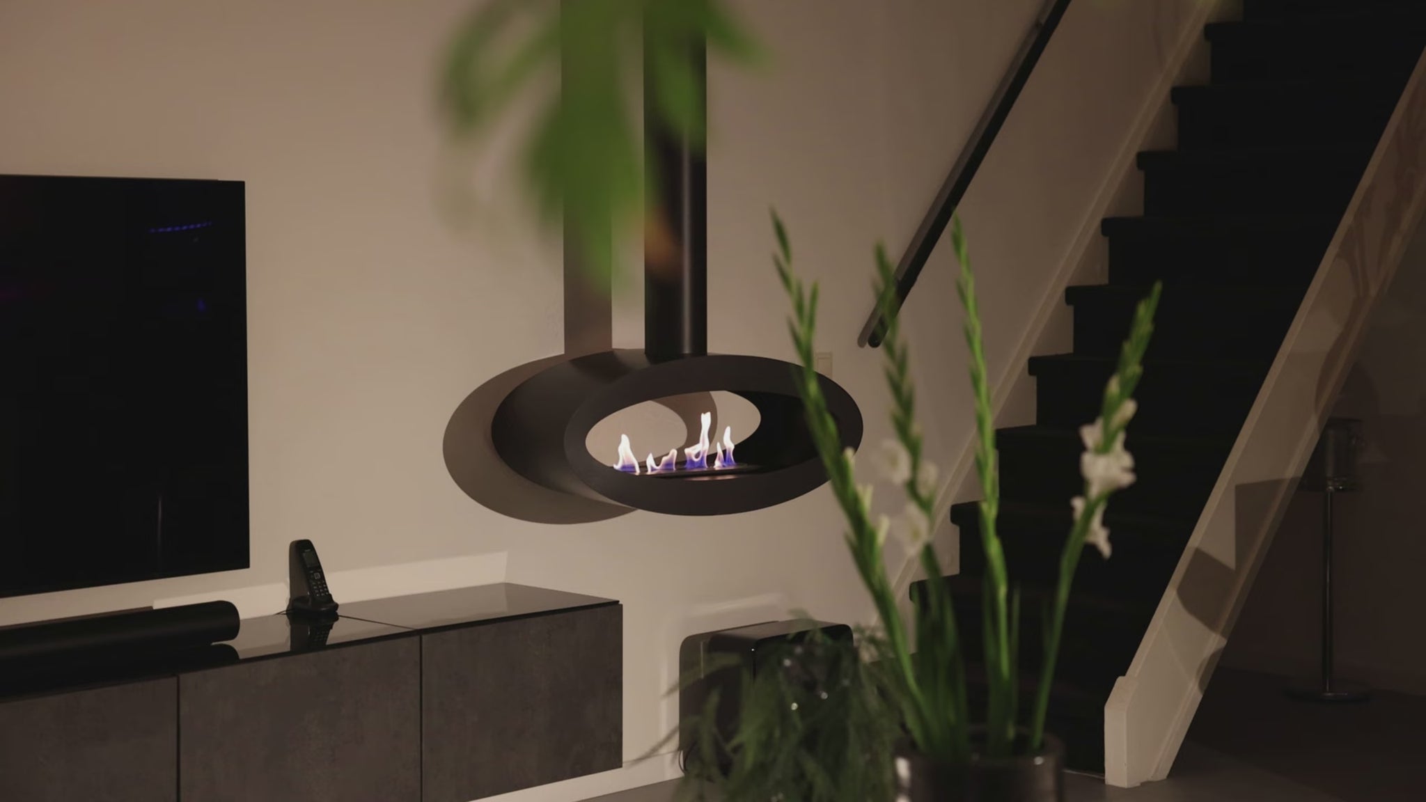The fireplace is mounted to the ceiling via a sleek, minimalist pipe that seamlessly integrates with the design. The pipe length is fully custom-made, allowing it to be precisely adjusted to the ceiling height and the desired hanging position. This makes the fireplace suitable for both standard and high ceilings and allows it to be perfectly integrated into any interior design. With its modern design, floating appearance, and customization options, this ceiling fireplace is an exclusive eye-catcher that effortlessly combines luxury, warmth, and design.